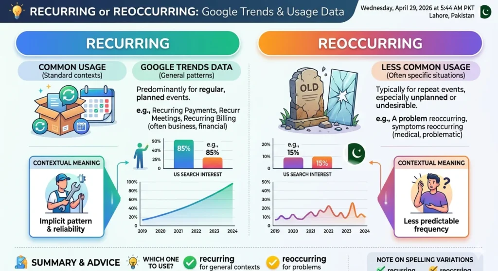Many people search “recurring or reoccurring” because the two words look almost the same. They both seem right. This creates confusion in writing, emails, and even business terms like payments or meetings.